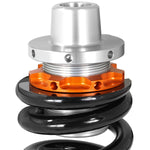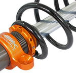 aFe Control is proud to release the Featherlight Single Adjustable Coilover System for the 2014-2019 BMW M2/M3/M4 (F80/82/83/87) chassis. Developed on the track and refined for the street, both ride height and damping are easily adjustable allowing for fine tuning your BMW’s stance and ride quality! Packed with features, the coilovers are precision CNC machined from 6061-T6 Aluminum, hard anodized and assembled in our Corona, California production facility. The mono-tube construction utilizes a floating piston to separate the oil and nitrogen gas, allowing for predictable handling and a consistent feel, while the spring rates have been optimized for street and track use. The front coilovers features a inverted mono tube design which places the damping adjuster on the bottom of the shock, allowing for quick easy adjustment. 36mm high strength hard chromed strut shafts house the double digressive valving and are capable of high braking and cornering loads, translating into less bind and a smoother operation. In the rear, CNC machined 6061-T6 aluminum ride height adjusters are employed maintaining the factory spring location for quiet operation and strength. The rear shocks feature the CIRC (Concentric Integrated Remote Canister) system that more than triples the gas volume over a standard coilover resulting in consistent operation over a wide temperature range and throughout the stroke. Since both coilovers employ double digressive valve technology, the easy touch rotary knob will adjust both compression and rebound in one device. The 24 distinct settings on the front and rear shocks accommodate for a comfortable street feel, all the way up to track settings. Elevate your driving experience with the comfort, precision and excitement of aFe Control Featherlight Adjustable Coilovers.
