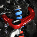 The control arm body is CNC machined from 6061-T6 billet aluminum. Unique top design and machined bottom pockets for weight savings. The arm is finished with red anodizing with laser engraved logo.