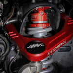 The control arm body is CNC machined from 6061-T6 billet aluminum. Unique top design and machined bottom pockets for weight savings. The arm is finished with red anodizing with laser engraved logo.